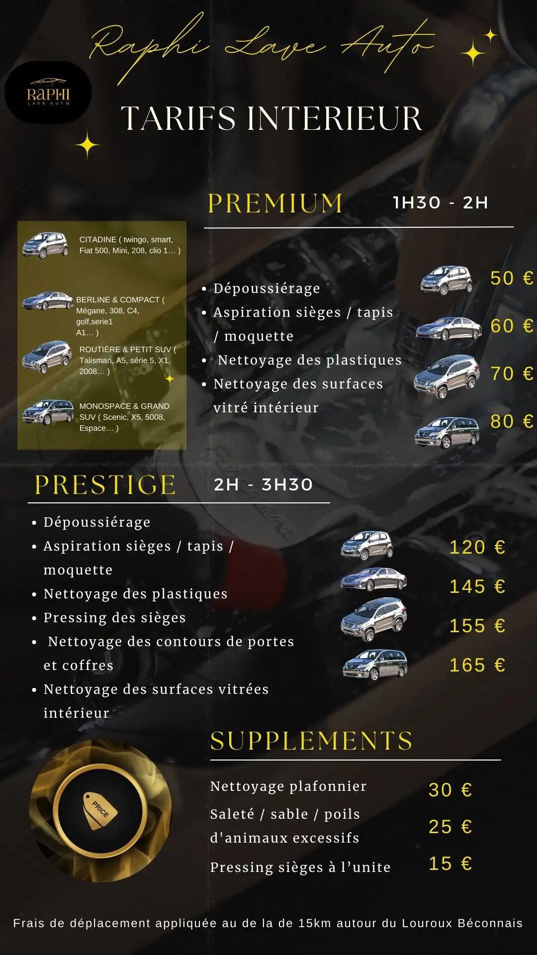 Ma prestation comprend le nettoyage des sièges, des tapis, du tableau de bord, et de l'intérieur des vitres. Vous pourrez ainsi profiter d'un véhicule propre et agréable à conduire.